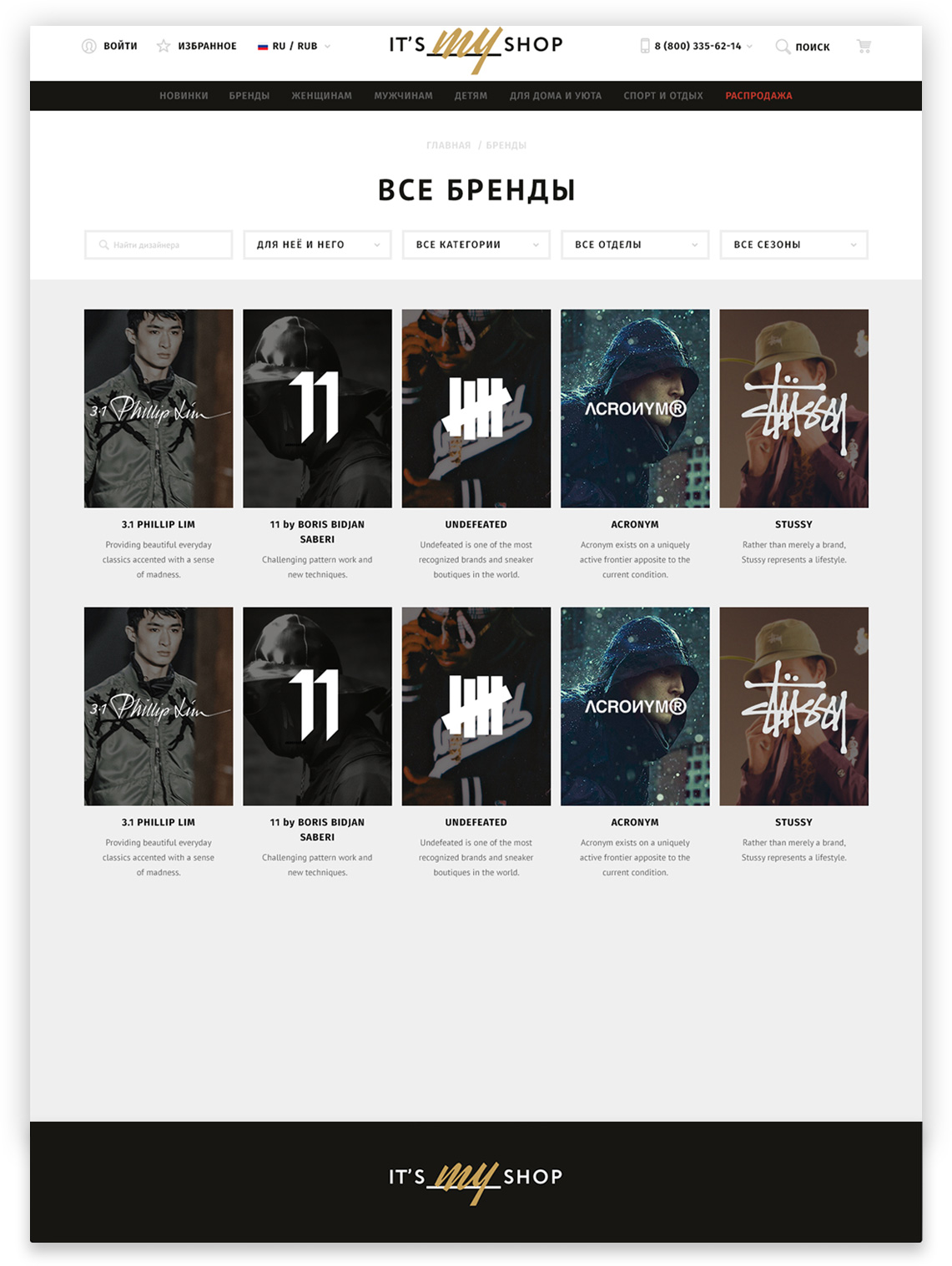 IT'S MY SHOP is a platform for novice, regional designers to form fashion collections and share with the people that matter in the industry. The primary focus is on clothing, shoes and accessories, but further expansion into cosmetics and decor allows for an evolution into all types of fashion design. The site is actively promoted throughout the Russian Federation and beyond, with products shipped worldwide. Our objectives were to create the concept, visual design, conversion logic, logo and fonts, site structure and even their private office design.
